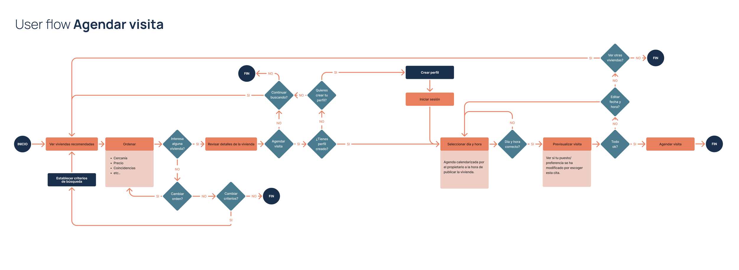 Desarrollamos los User flows de las 3 funcionalidades para definir cada fase del proceso desde que el usuario abre la app por primera vez hasta que obtiene su recompensa: una lista de viviendas que son, de verdad e ideales para él, para las que puede pedir una visita.